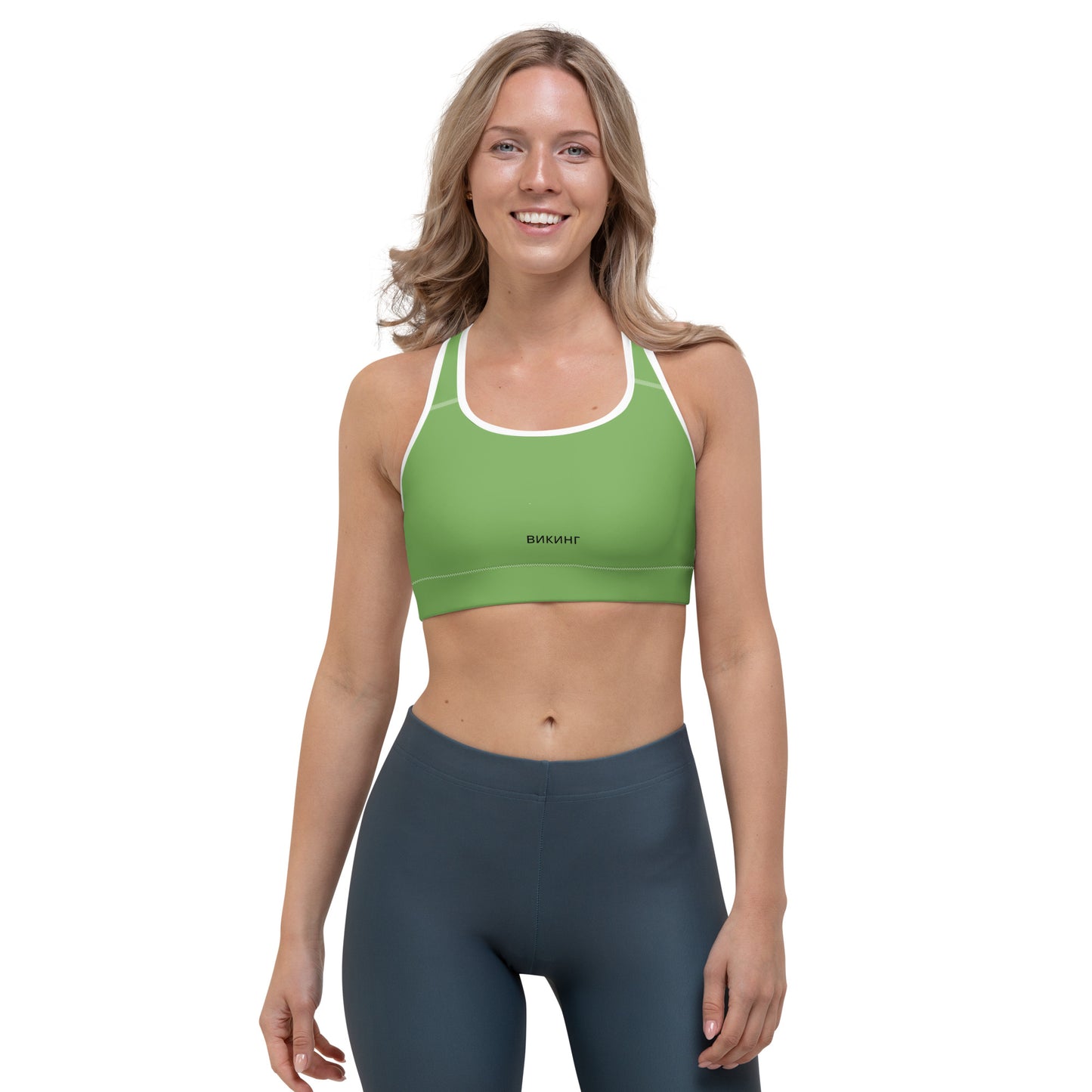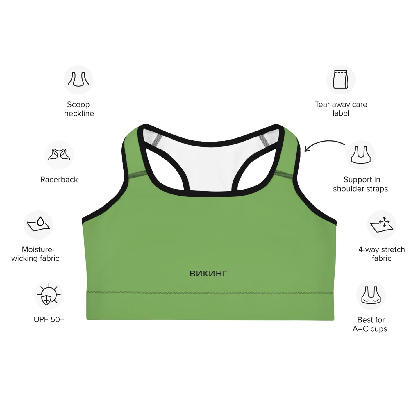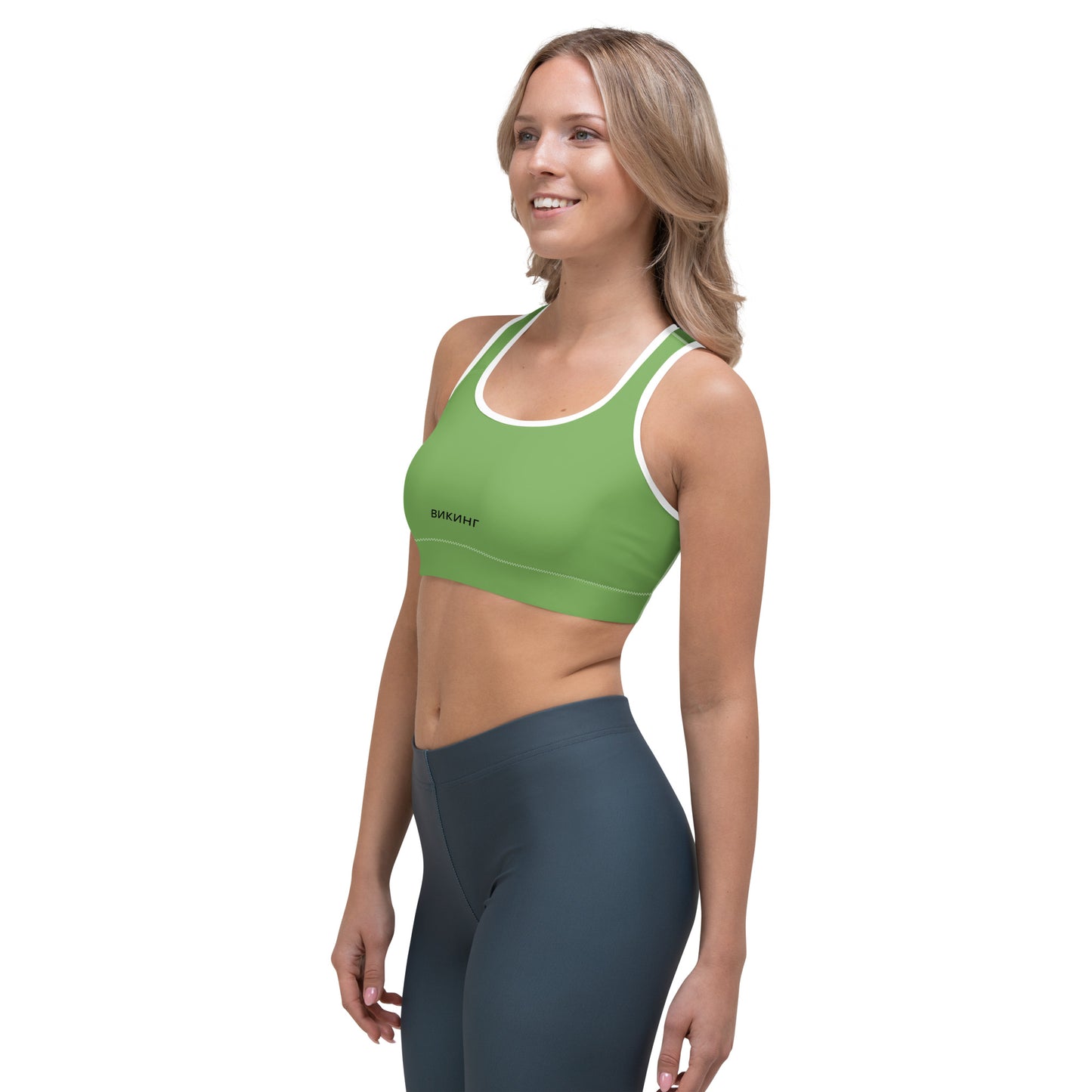 ВИКИНГ Original Shamrock Green Athletic Sports Bra. This gorgeous sports bra is made from moisture-wicking material that stays dry during low and medium intensity workouts. The bra has support material in the shoulder straps, double layer front, and a wide elastic band to ensure constant support.